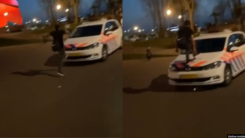 It's a weird action that's almost unbelievable: a man who climbs on top of a police car and then starts jumping like he's standing on a trampoline. The incident, which was recorded on video and is now widely shared on social media channels, raises many questions. Was he under the influence? Not only about the behavior of the man himself, but also about the dozens of bystanders who saw the incident up close without intervening. They still encourage him.